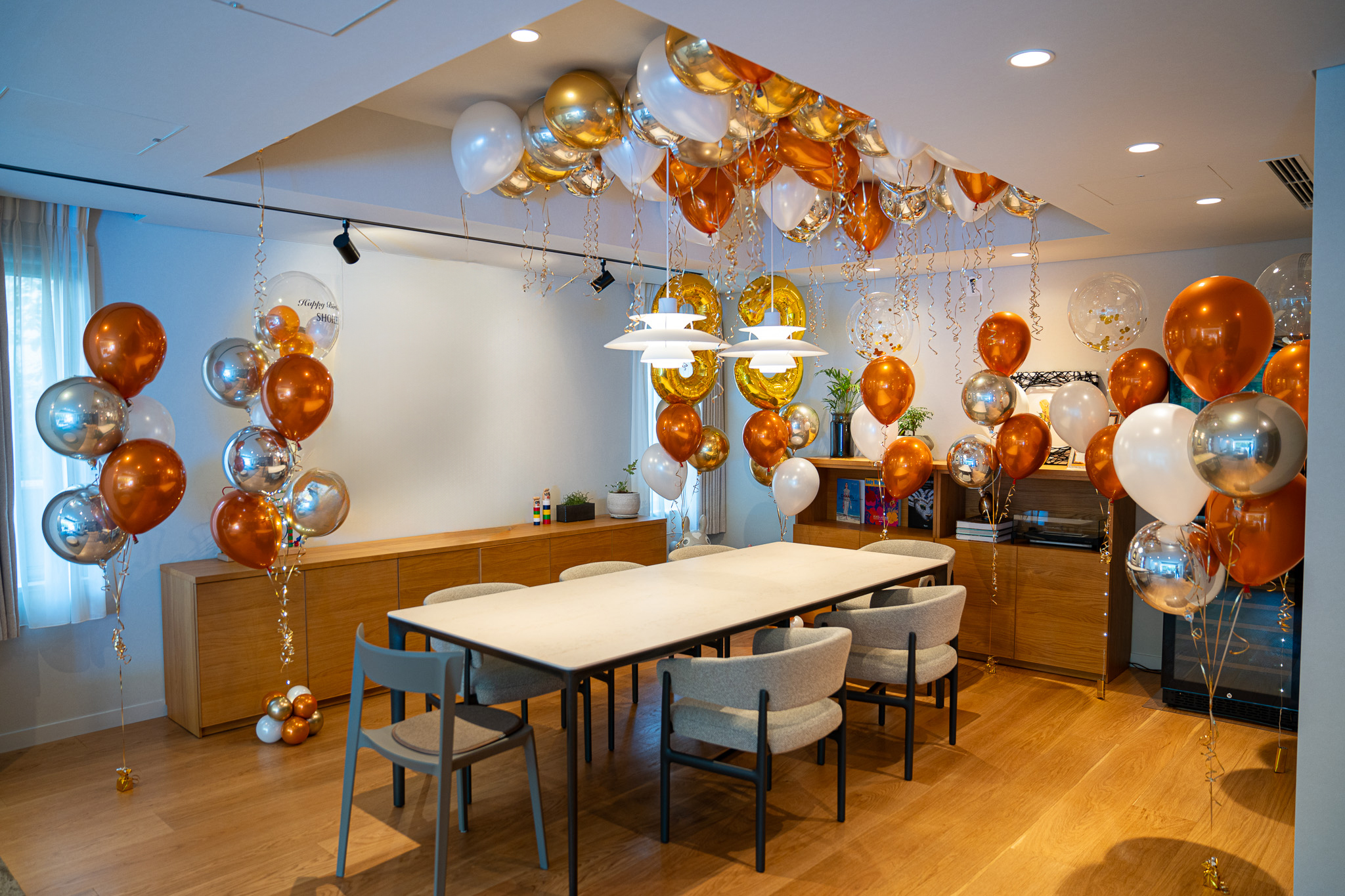 为您的家进行色彩协调,以配合房间的气氛,将您的家变成一个派对场所。我们为整个空间提供整体设计服务,包括装饰天花板的气球和装饰整个房间的花束布置。